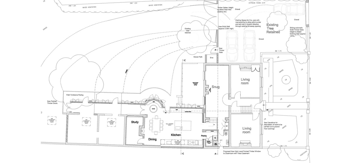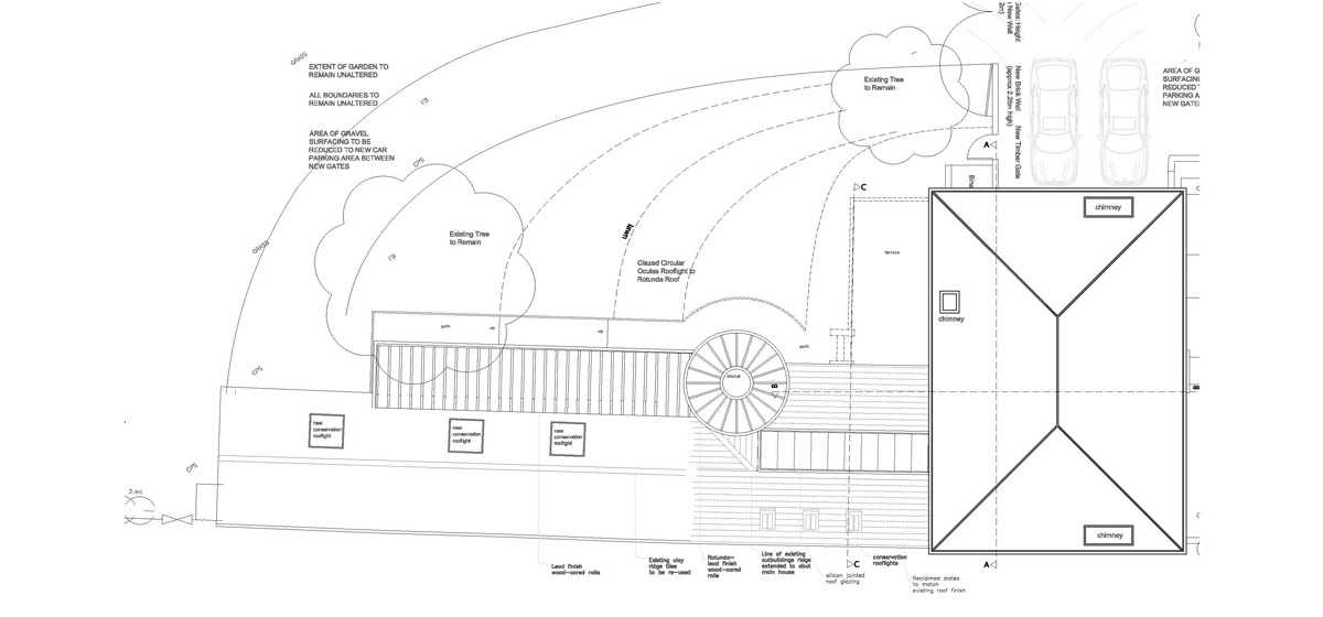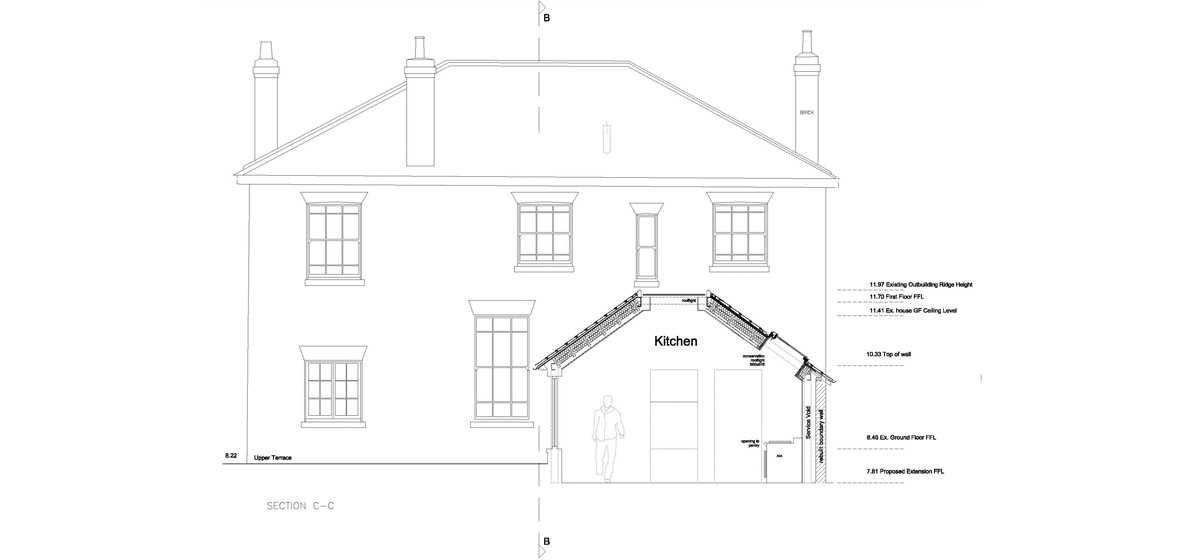 The outbuildings are to be extended to the main house at ground floor level creating a seamless connection when viewed from adjacent access lane and the neighbouring listed cottage.