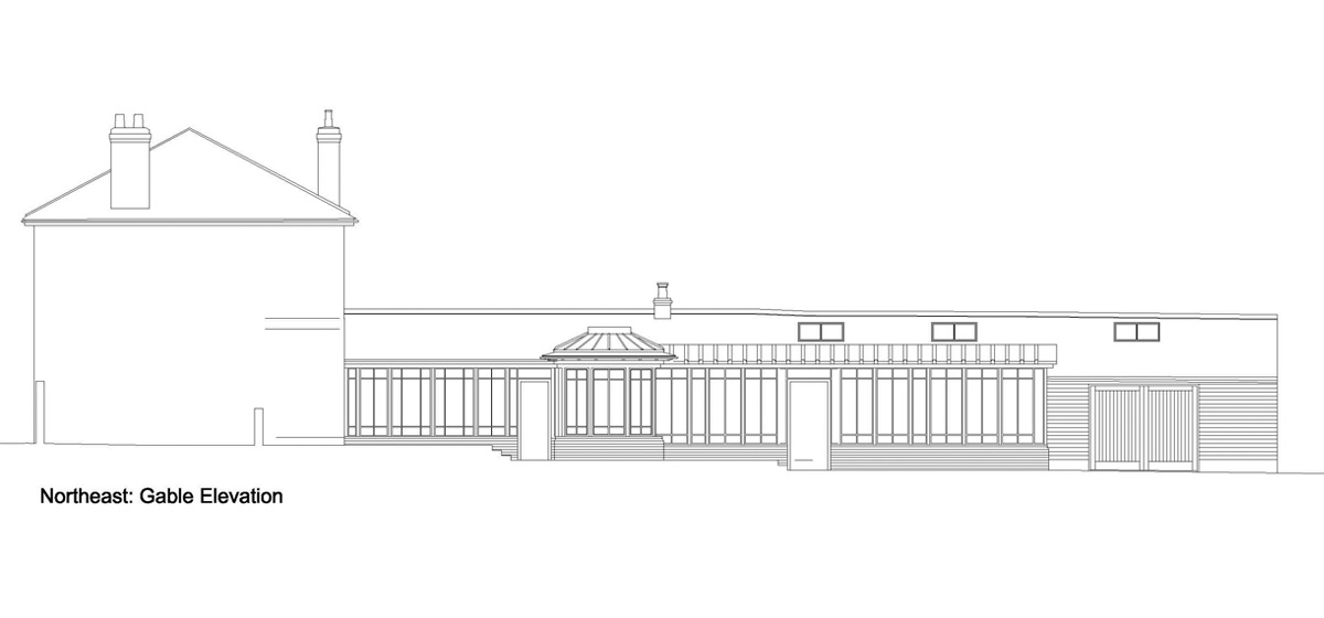 A timber glazed circulation route running along the garden facing wall of the outbuildings joining the accommodation created within them must extended to the ground floor accommodation of the house. Borrowed light from this circulation route must filter into the spaces within the outbuildings.
