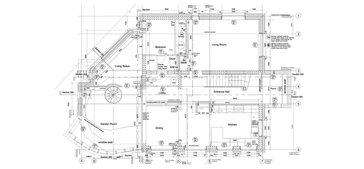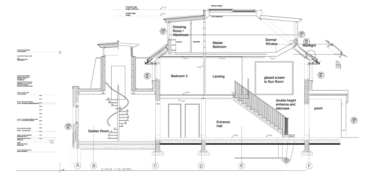 Access to the two storey element to the rear extension is from the Garden Room via a spiral stair which is surmounted by a circular lantern under its lead roof. This fun addition to the dwelling provides pleasant views of the garden, while providing articulation and pivot point between the rectangular massing of the house and more organic form of the rear extension. Beneath the two storey element lies a self-contained bedroom with en-suite providing accommodation for an elderly relative.