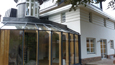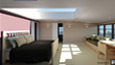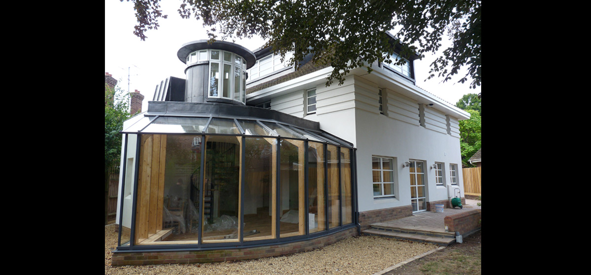 A Sun Room is located on the first floor of the two storey extension to replacing the previous first floor external terrace. Large glazed opening windows are located at the external corner facing due south. In order to prevent solar gain within the space, external solar control louvres can be deployed and then raised into the deep eaves when not required.